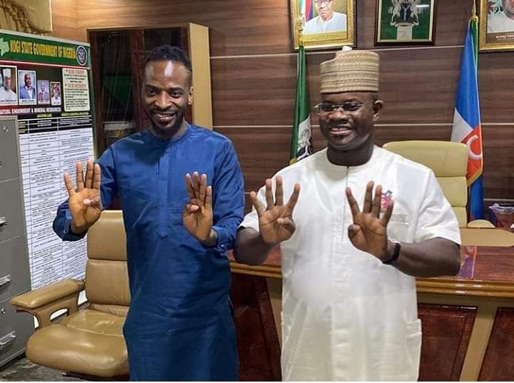 Abolore Adegbola Akande stage name 9ice was hosted by kogi state governor, Yahaya Bello at the government house where they displays the 4+4 symbol in his office.