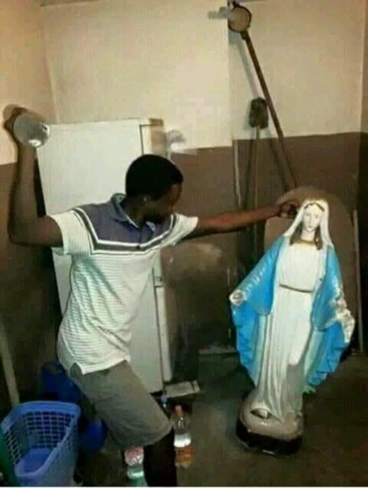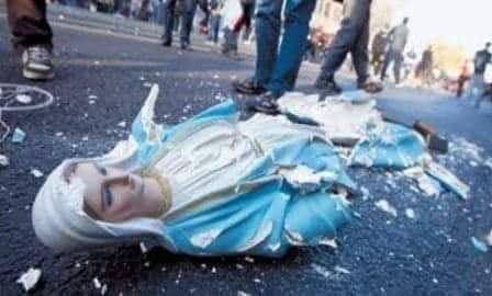 Angry men destroy statues of Virgin Mary claiming that it is an Idol not an Image of the mother of Jesus.