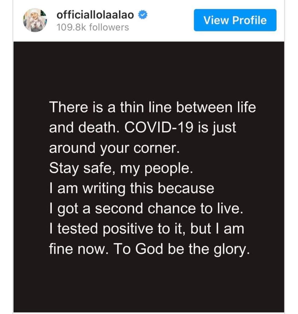 Nollywood actress, Lola Alao has revealed that she tested positive for coronavirus but has fully recovered from the virus.