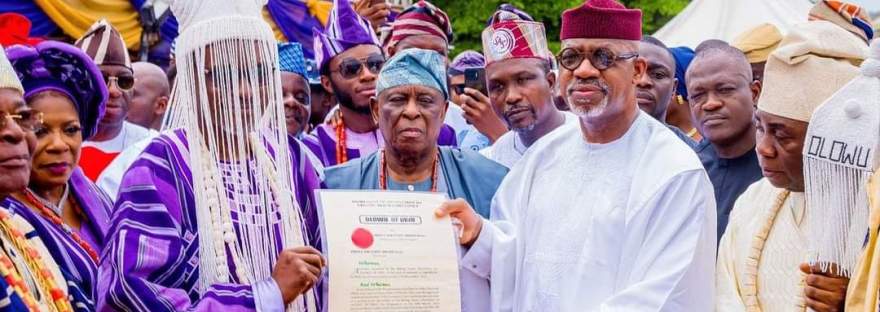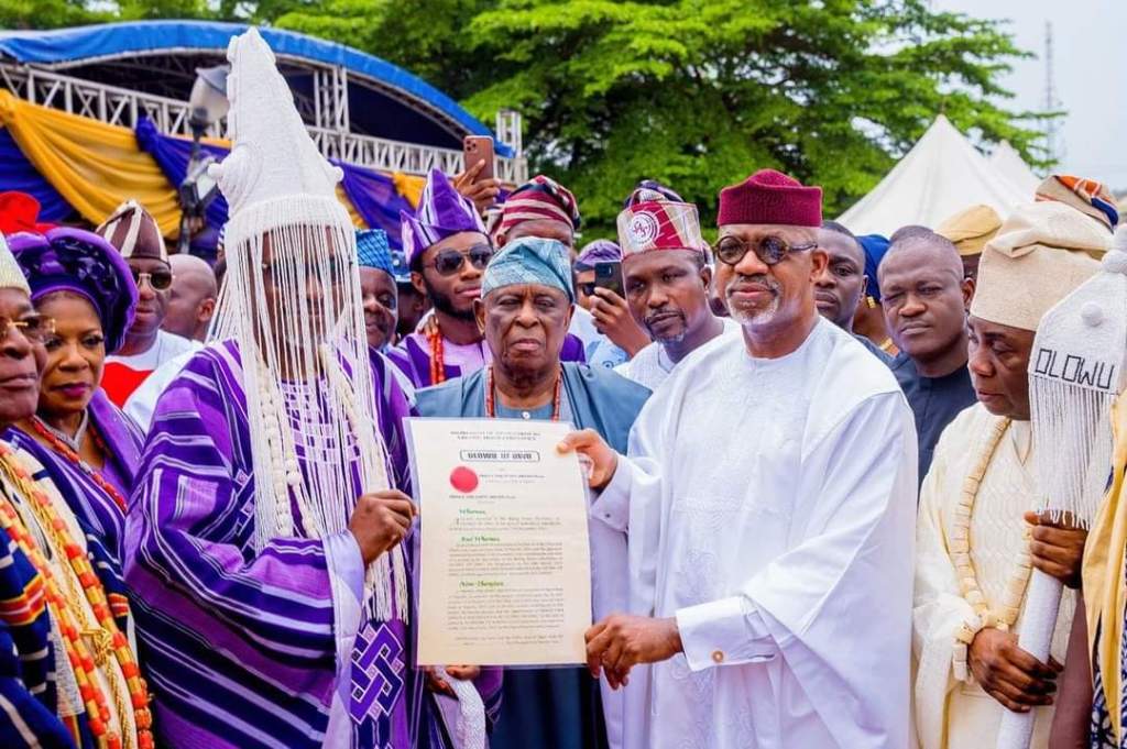 Ogun State governor, Dapo Abiodun, on Saturday, presented the instrument of office to the 14th Olowu of Owu, Oba (Prof.) Saka Matemilola, with a charge to see his installation as a call to service towards the development of Owu Kingdom and the state in general.