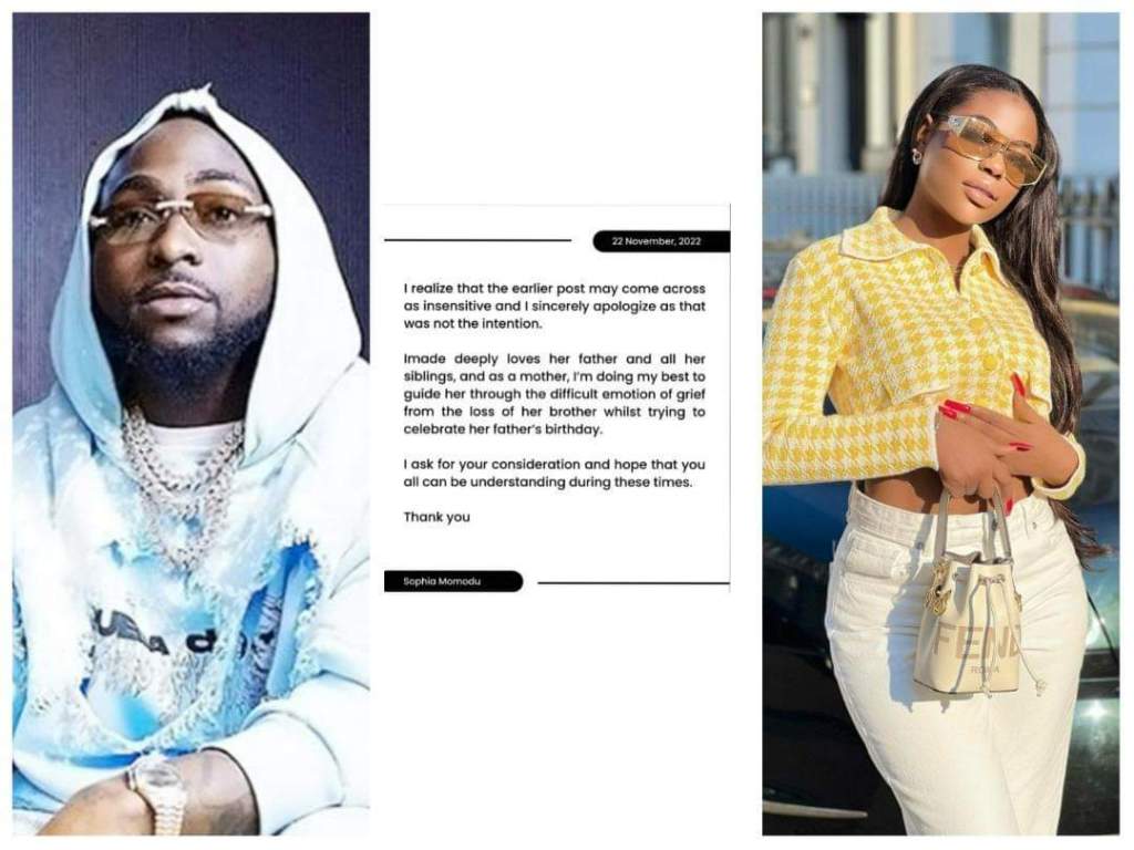 Sophia Momodu, the mother of singer Davido’s first child, Imade, has apologised publicly for a birthday post she made on her daughter’s behalf to mark his birthday.